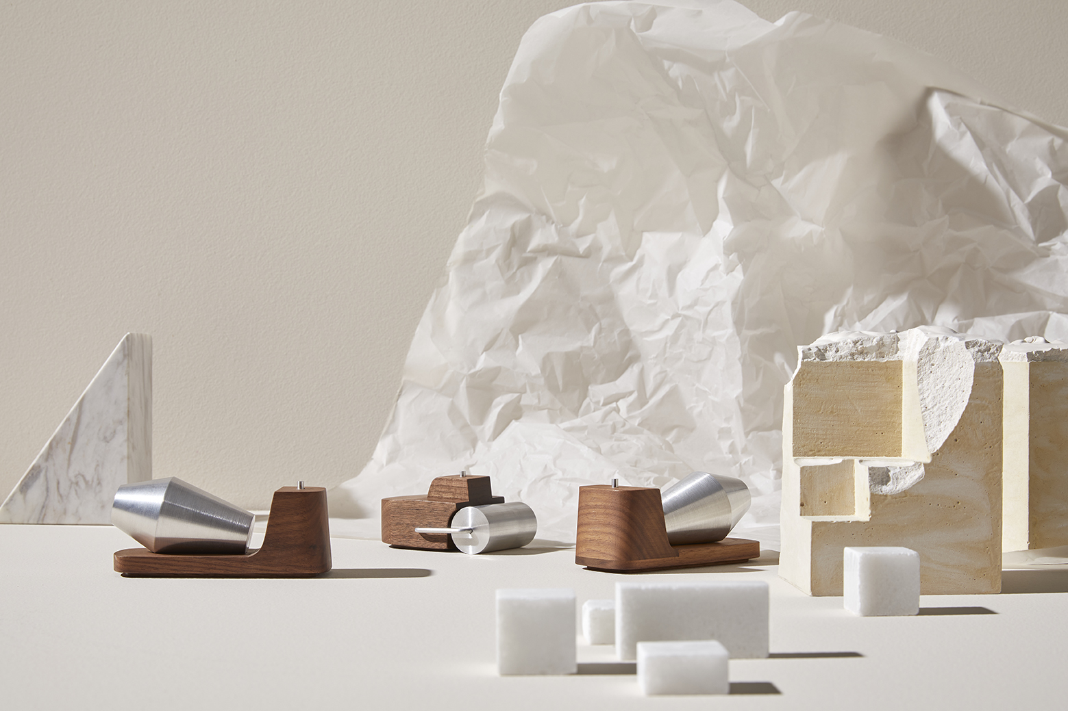An ode to the construction, the universe of creation from a pure visceral point of view. Daily life elements we found in the cities frequently seen as raw and big bodies, now transformed into abstract and purified objects.